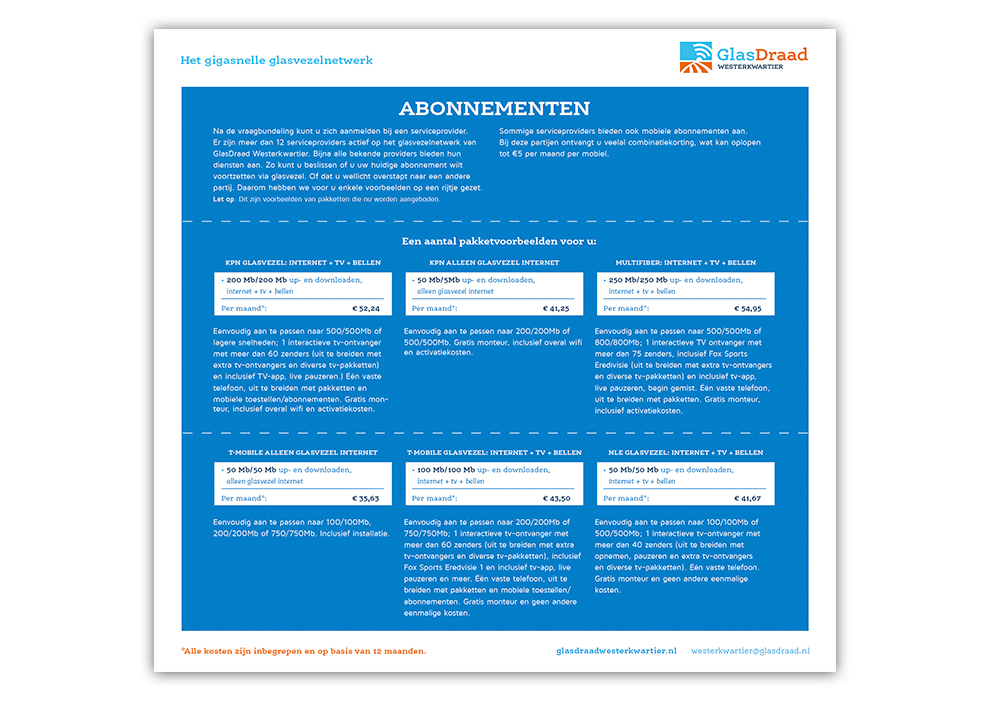 Na het behalen van de 40% aanmeldingen zullen wij u informeren over de serviceproviders waar u een abonnement naar keuze kunt afsluiten. Indien u geen abonnement heeft afgesloten voor 28 februari 2023 en uw woning wel is aangesloten (of wordt aangesloten), dan brengen wij u eenmalig extra aansluitkosten in rekening van € 250,-. GlasDraad hecht veel waarde aan keuzevrijheid voor bewoners. Wij vinden het belangrijk dat u een abonnement kunt kiezen dat bij uw persoonlijke situatie past. Daarom bieden diverse onafhankelijke serviceproviders hun diensten over ons netwerk aan.